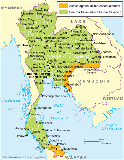FCDO advises against all but essential travel to parts of the south, near the Thailand-Malaysia border: